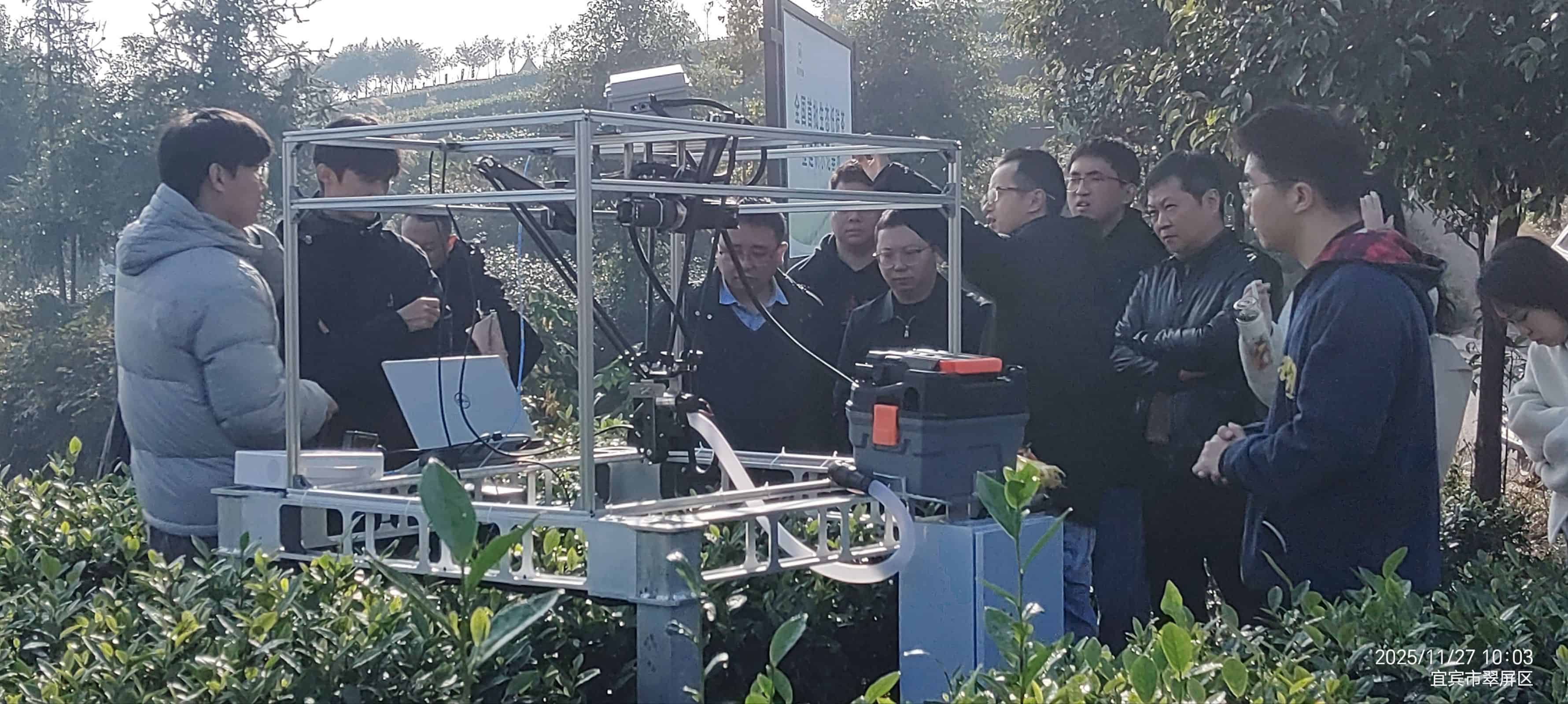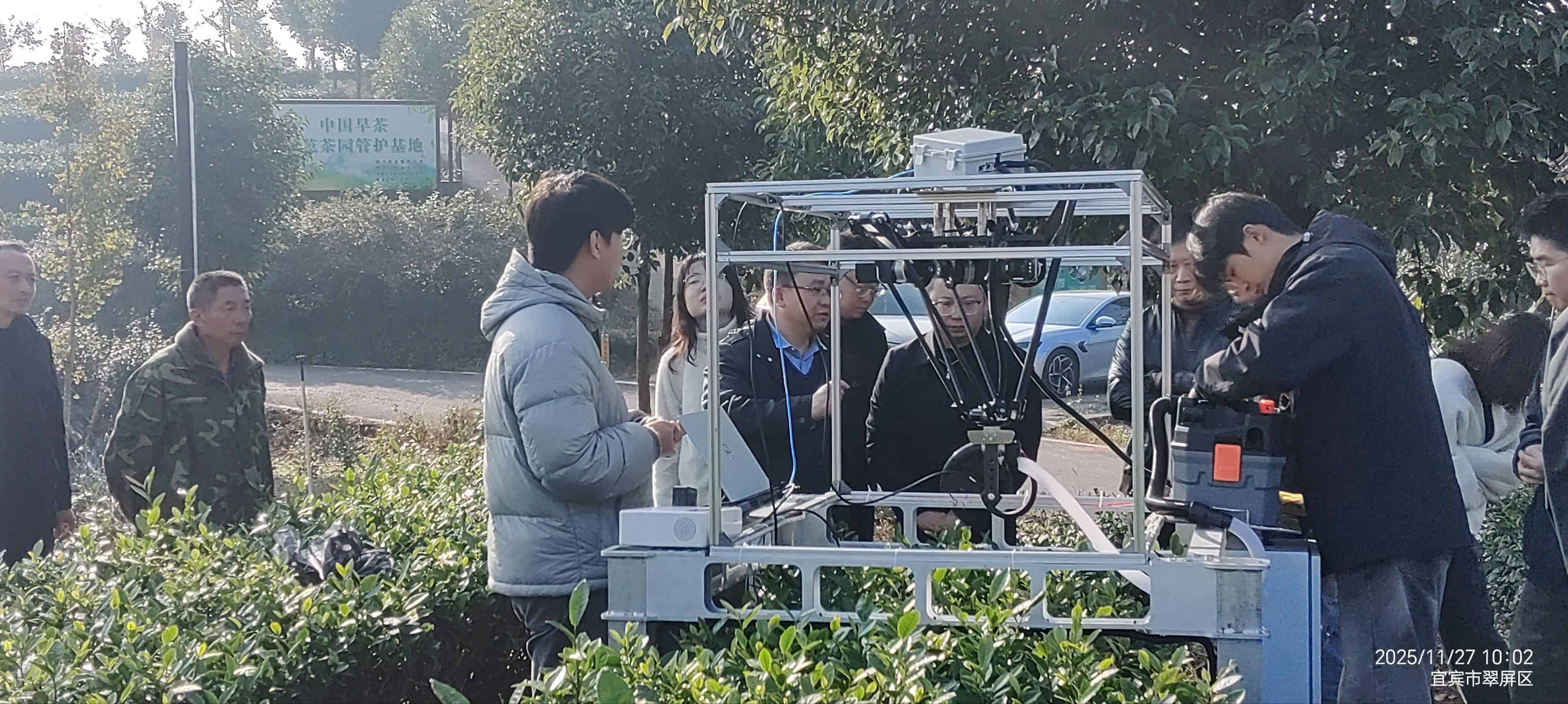 本次活动将组织生活与科研实践场地直接移至茶叶生产一线,是支部探索“党建+科研+社会服务”新模式的一次生动实践。在基地茶园,项目组同学首先对“采茶机器人”原型机进行了现场部署与功能演示。机器人在复杂地形下的移动能力、基于机器视觉的嫩芽识别定位精度以及机械臂的精准采摘动作,成为了现场关注的焦点。