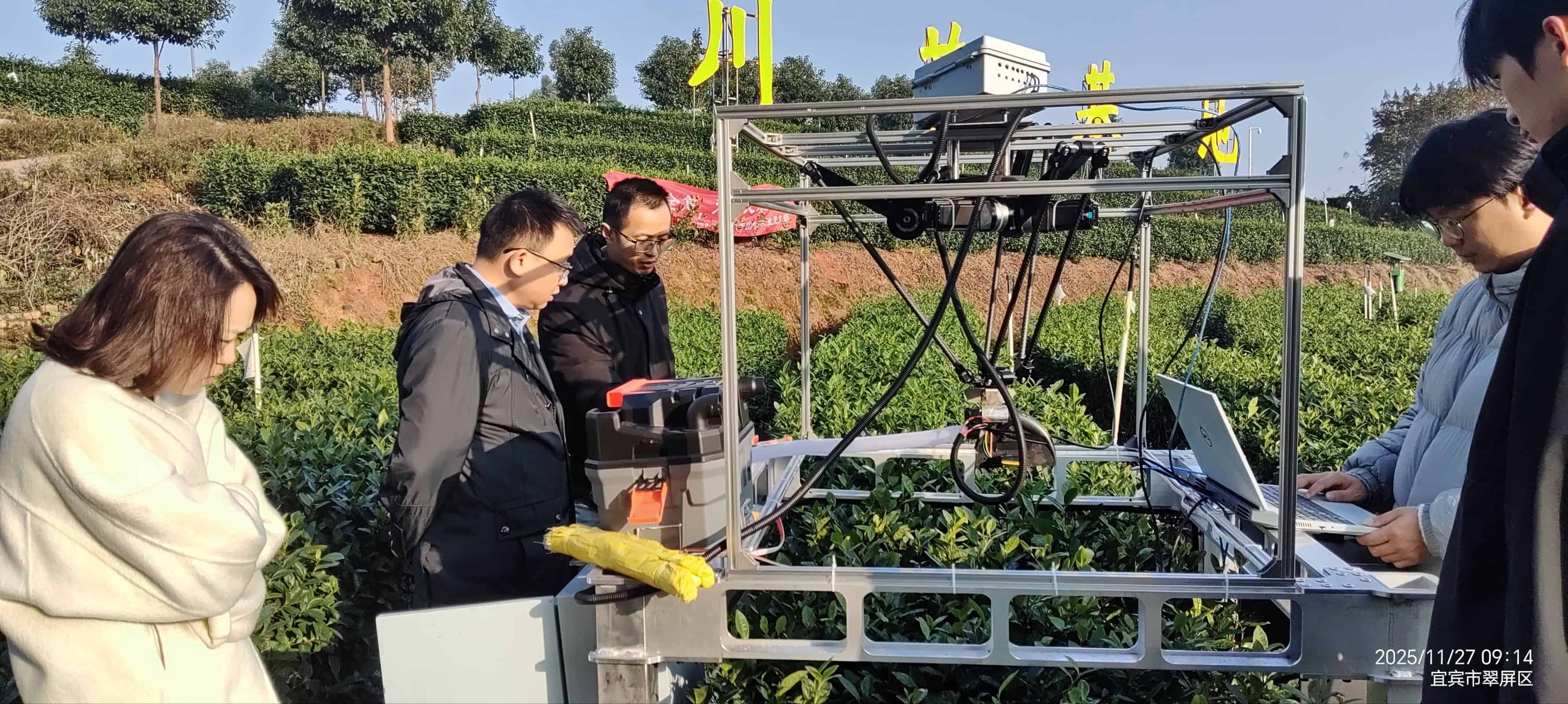 为深入推进党建与科研深度融合,以实际行动服务乡村振兴战略,2025年11月27日,智控教研室党支部依托其核心科研项目—“山地丘陵智能采茶机器人”研发,在宜宾市茶川集团的川茶基地组织了一场别开生面的“人机协同”主题实践与技术研究活动。学校党委副书记、校长张学尽和智控技术党支部书记代云中博士及其团队成员与川茶集团副董事长颜麟丰进行了深入的现场交流与研讨。