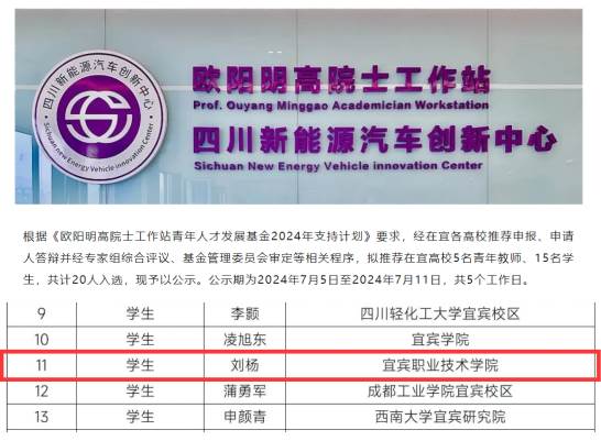 《欧阳明高院士工作站青年人才发展基金》一直致力于挖掘和培养青年人才,为他们提供更广阔的发展空间和支持。本次共有在宜高校的5名青年教师和15名在校学生入选。我校刘杨同学作为唯一一名专科生入选。