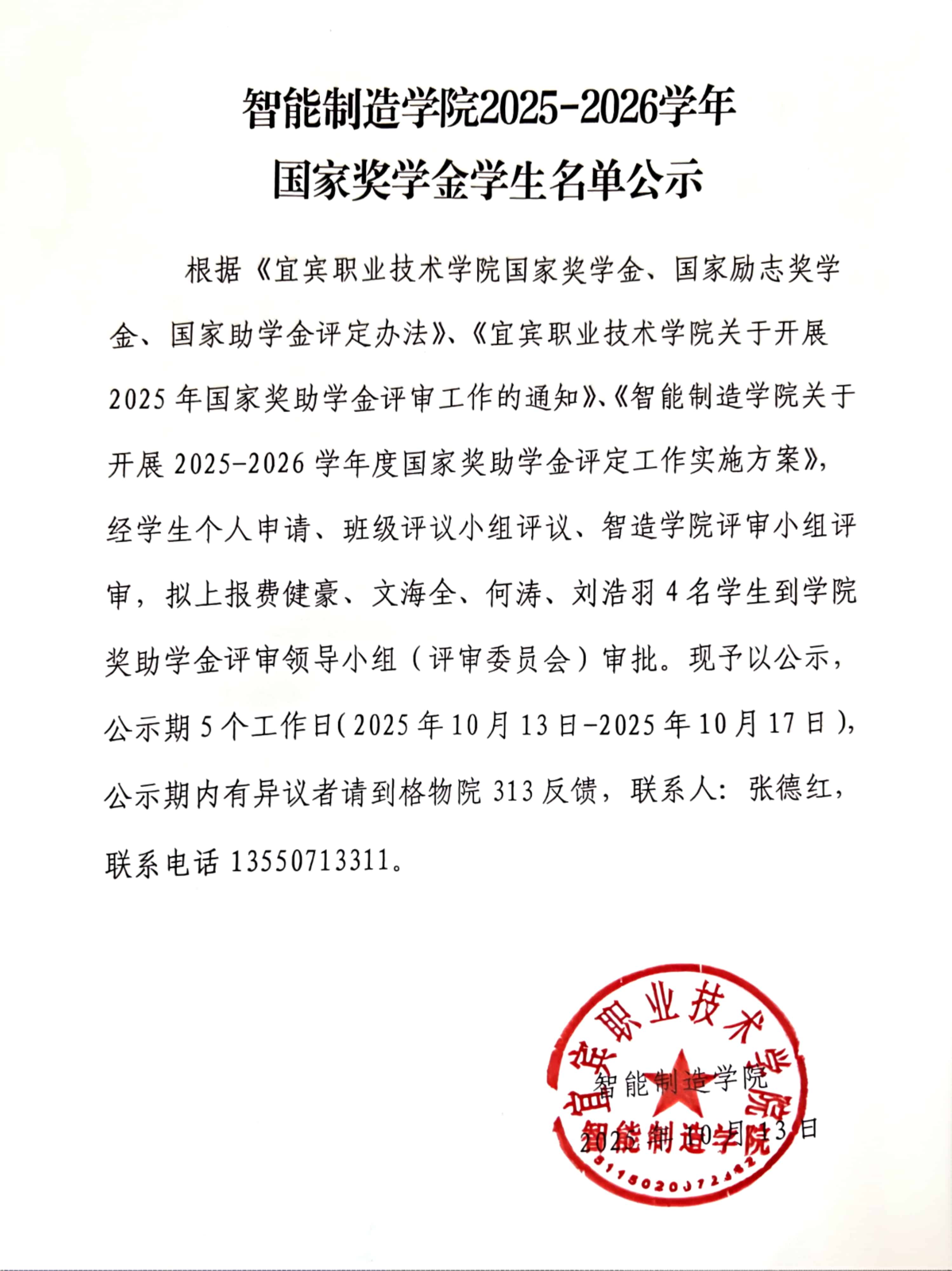 智能制造学院2025-2026学年国家奖学金学生名单公示