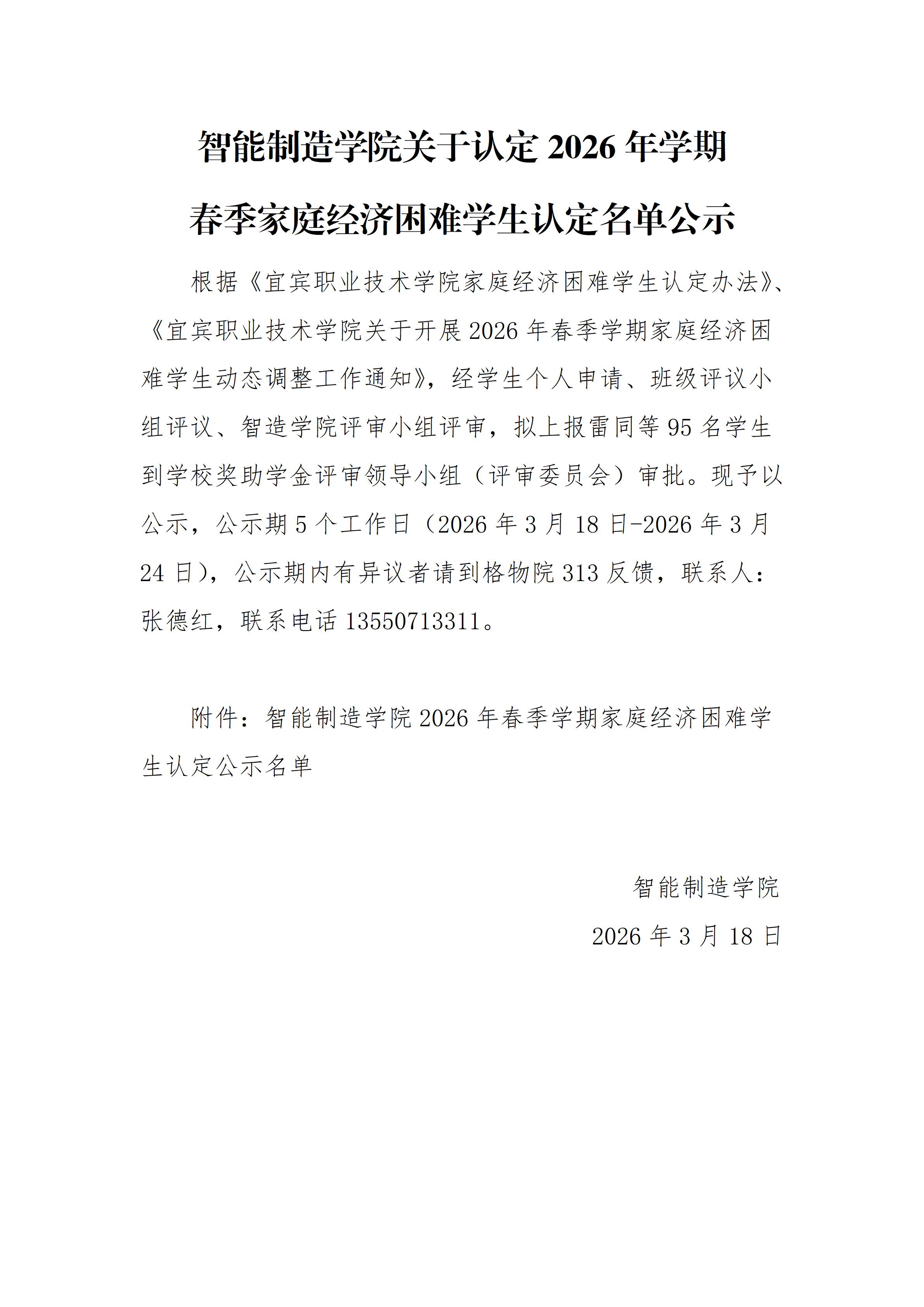 智能制造学院关于认定2026年学期春季家庭经济困难学生认定名单公示