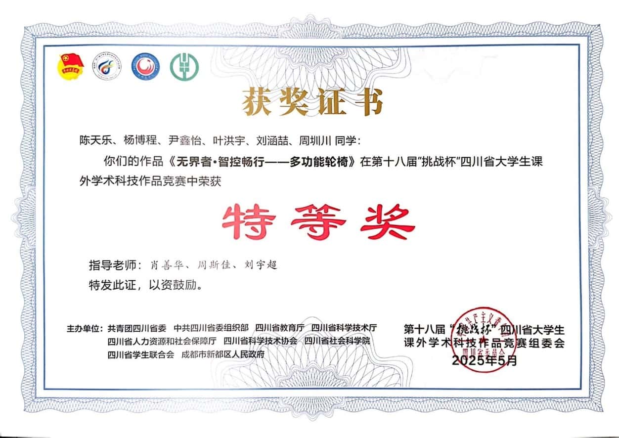 无界者▪智控畅行团队以“多功能轮椅”项目为起点,秉持从零探索、夯实基础、敢创苦练,历经百余次实验,不断进行技术迭代和优化。团队作品“无界者▪智控畅行——多功能轮椅”项目荣获“特等奖”,开创了我校参加省赛总决赛以来最好成绩。这份荣誉不仅是团队所有成员与校团委协同奋斗的结晶,更离不开智能制造学院领导的关心支持和帮助,智能制造学院搭建了以肖善华教授领衔的指导教师团队,提供了团队工作室平台和相关的实践设备,为团队获奖打下了坚实的基础。