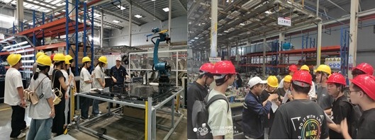 在随后的实训中,39名学生被分为三组分别深入冲压车间、焊接车间等进行现场观摩。在冲压车间,法那科机器人精准切割板材的场景令同学们惊叹;焊接车间内,多台机械臂协同作业的高效场景,让学生们直观感受到智能制造的强大效能。